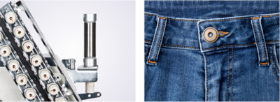 Relevage automatique du pied-de-biche pour une couture efficace et sans effort des ceintures de jeans, optimisant la productivité et le confort d’utilisation.